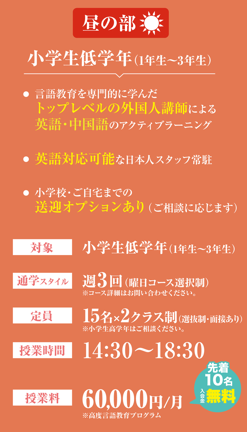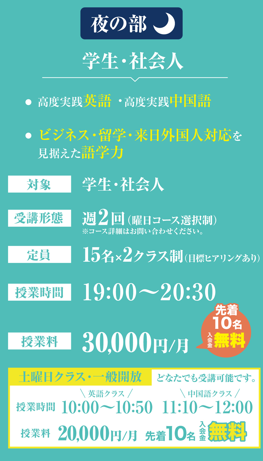 | 開校時間 | 【平日】 昼の部|アフタースクール 夜の部|語学スクール 英語クラス 中国語クラス |